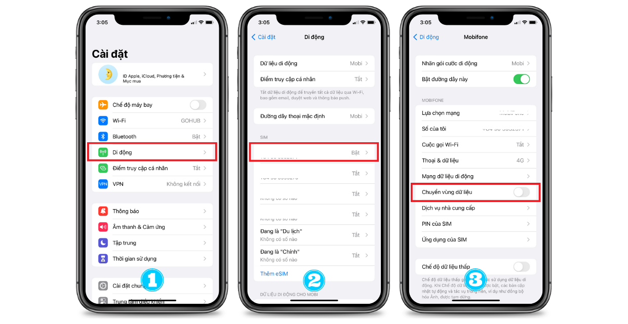 Cài đặt > Di động > Chọn SIM > Bật Chuyển vùng.